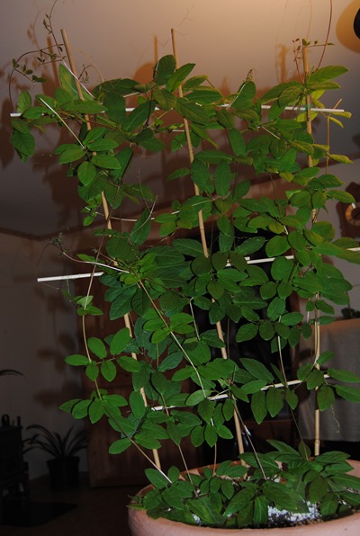 Klokkeranken vokser nå så voldsomt at jeg måtte toppe den for andre gang. Det tok ikke lange tiden før den vokste over stativet som jeg lagde. Høyden på plantene er nå (etter topping) ca 120 cm…. Tenk det er bare 1 april i dag…og jeg må ha den inne i hvertfall en måned till?!? Vi får se…